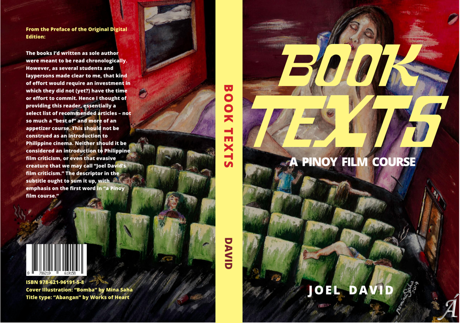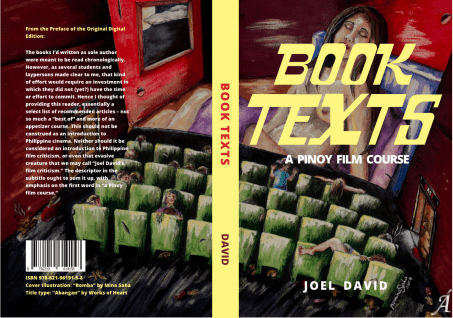 The books I’d written as sole author were meant to be read chronologically (according to date of original publication). However, as several undergraduate students and laypersons made clear to me, that kind of effort would require an investment in which they did not (yet?) have the time or effort to commit. Hence I thought of providing Book Texts: A Pinoy Film Course, essentially a select list of recommended articles – not so much a “best of” and more of an appetizer course, pardon the semi-academic pun. This should not be construed as an introduction to Philippine cinema (although I do have a forthcoming book, SINÉ, that attempts to fulfill that function). Neither should it be considered an introduction to Philippine film criticism, or even that evasive creature that we may call “Joel David’s film criticism.” I provided a descriptor in the subtitle, and that ought to sum it up, with emphasis on the first word (cum letter) in “a Pinoy film course.”