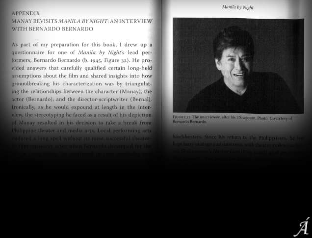 Above (click to enlarge) is the first page of the interview I conducted with Bernardo Bernardo, originally posted on this blog and also titled “Manay Revisits Manila by Night.” It is now an Appendix in my Arsenal publication, Manila by Night: A Queer Film Classic (Matthew Hays & Thomas Waugh, series eds.). Until a Philippine publisher reprints it, the book may be purchased from North American booksellers including the publisher’s website.