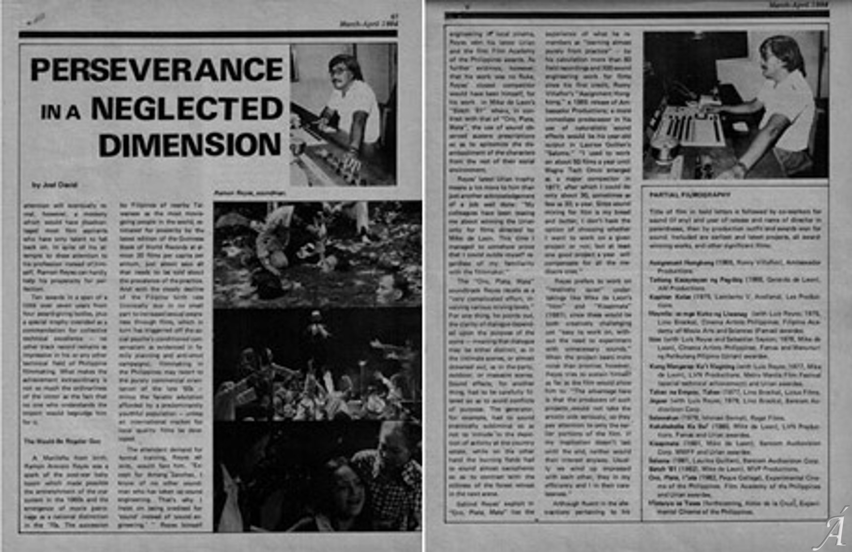 For his part, Reyes intends to persist in the pursuit of his career in the neglected dimension of film sound. Given the opportunity, he would not hesitate to work “for about three or four years in a more competitive milieu – the United States would be perfect – to acquire familiarity with advanced facilities and exchange knowledge and experience with experts.” Immigration would be out of the question though. “I’d still prefer to practice here, although a generation from now, when new blood comes in, I might have to start a stable business of my own just to be able to get by.” Such pessimism may not be in keeping with the promise of progress in local cinema, but for Reyes it will do. “At least by then I might be able to contribute a few things on my own terms.”