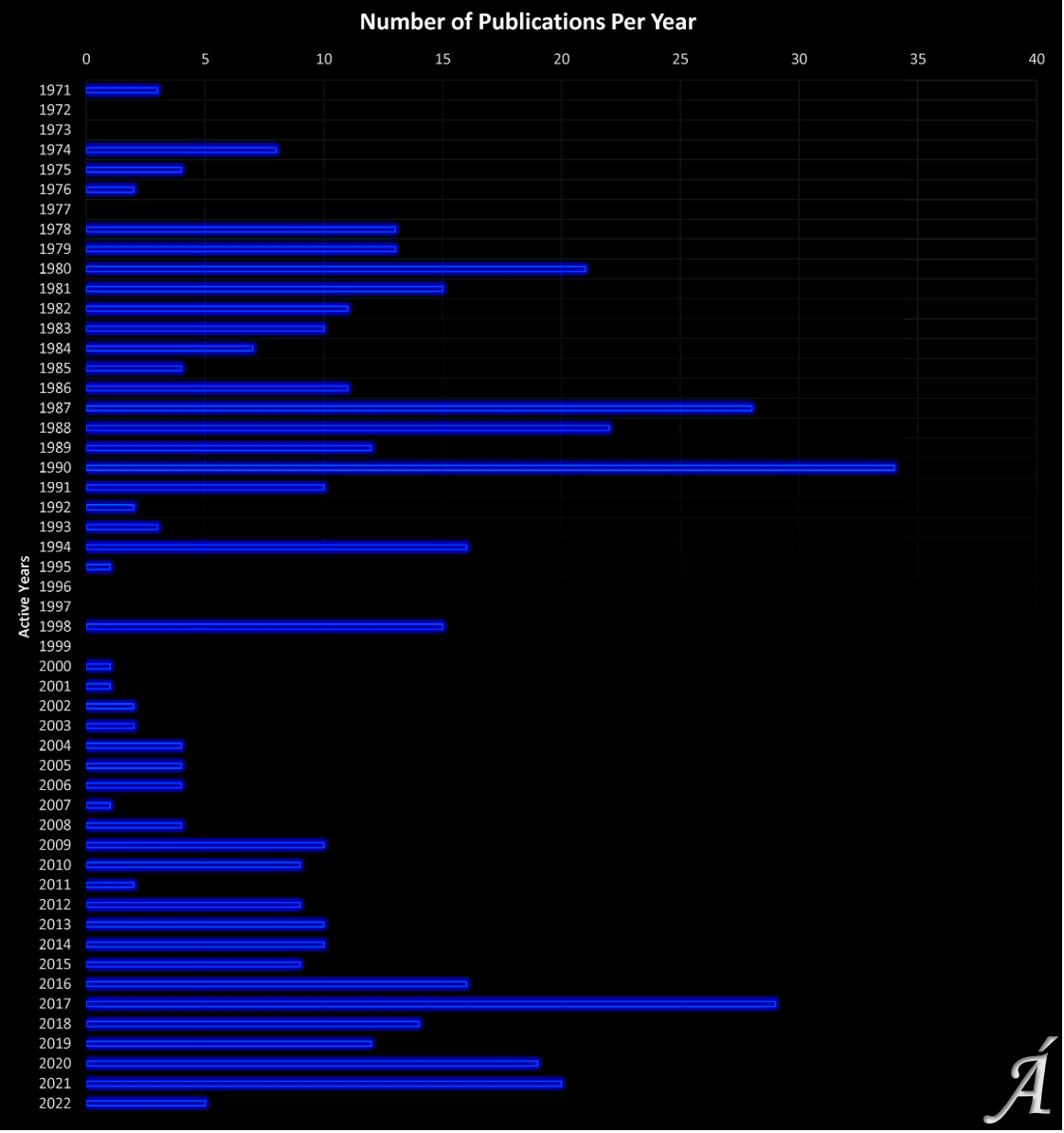 The following chart is based on a more comprehensive (nearly half a century!) file of my output than what I posted on the Chronologically Arranged Listing of Publications page. That one contains around 350 entries (as of May 2020) while this one counts over 400 in all. [Please click on the image for enlargement.]