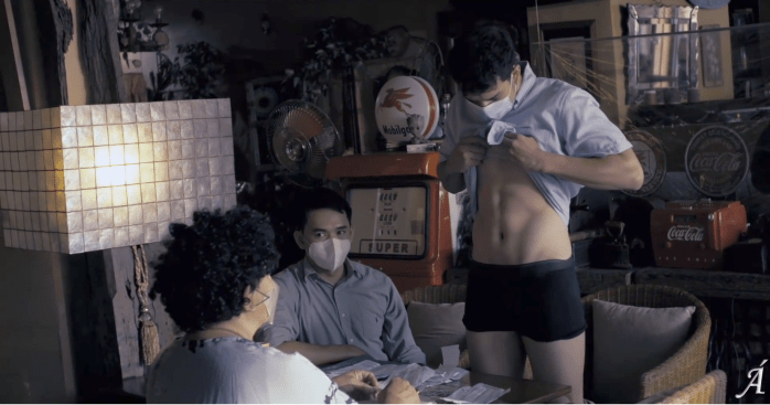 11011Joel C. Lamangan, who played the role of an unruly queer madam in MD, invests Lockdown with the same vision of an infernal underworld, but relocates the community to a coastal district, where Danny, an overseas worker forced to return after the global pandemic shut down the Dubai hotel where he worked, escapes from the mandatory 14-day quarantine to be able to raise funds for the recuperation of his recently handicapped father while acting as family breadwinner. The suburban setting considerably facilitates the mapping of territories that separate the seaside slum from the more affluent (and safeguarded) business centers, as well as the most militarized location of them all: the police compound with its discreet cluster of cottages for legally indefensible activities.