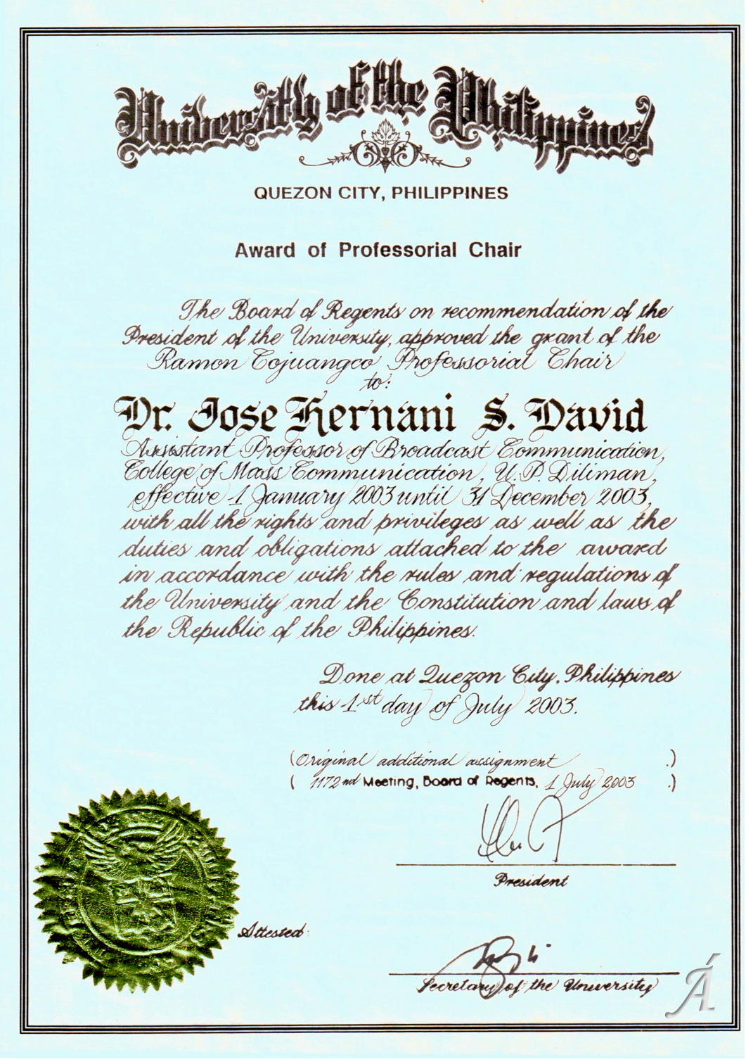- Ramon Cojuangco Professorial Chair (University of the Philippines College of Mass Communication, 2003);