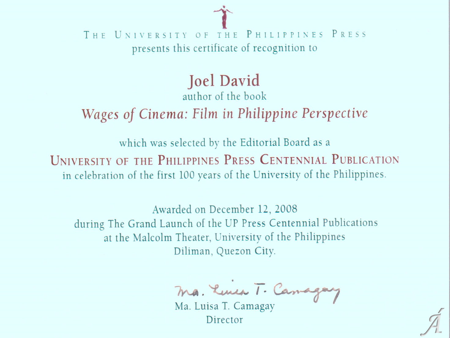 - Centennial Book Award for Wages of Cinema (University of the Philippines, 2008);