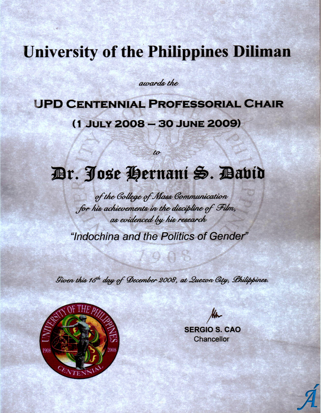- Centennial Professorial Chair (University of the Philippines, 2008);