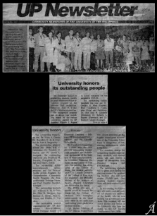 • The first batch of Outstanding Student Awards at the University of the Philippines, as reported in the UP Newsletter’s June 17, 1986, issue; this was when most national-university functions were still system-wide rather than campus-specific. I’m at the leftmost portion of the front-page photo. Clicking on the pic below will enlarge it but the original was in newsprint, so I’m afraid it might still be difficult to discern: