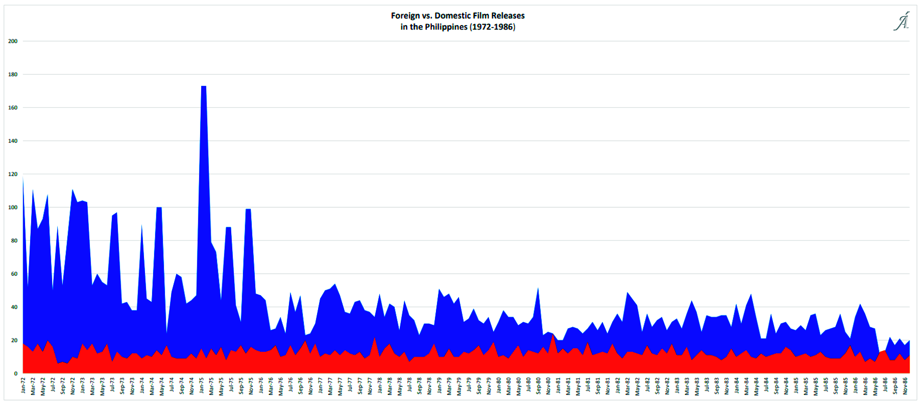• Annual Filipino Film Chart (2016), an expanded and extended illustration from my dissertation (2002); a spinoff chart tracks domestic film output vis-à-vis foreign-film releases during the martial law period of Ferdinand E. Marcos.