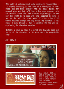 June 5 – Independent filmmaker Joselito (Jay) Altarejos posted an announcement of a screening of his excellent social-problem film, Jino to Mari, quoting a message I posted last April 9 on Facebook. Please click on the pic to enlarge it for readability.