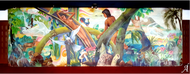 I could have replaced either one of two exterior shots of the Manila Film Center with the mural in the lobby, painted by Victor Cabisada Jr. and Peter Alcántara, then-impossible to access after a fire damaged the building (see this blog’s header image). In September 2020, an art historian, John Paul “Lakan” Olivares, posted the pic below (click to enlarge), apparently taken when the object was still new, on his blog